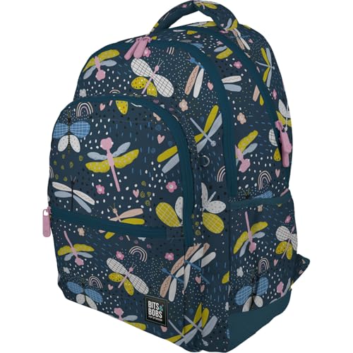 Grafoplás - Ergonomisk skolryggsäck, 33 x 46 x 22,5 cm, vadderad rygg och handtag, 3 fack, bärbar specialområde, anpassningsbar till vagn, gummimodell, Dragon Fly-design, samling bitar och Bobs, Blå