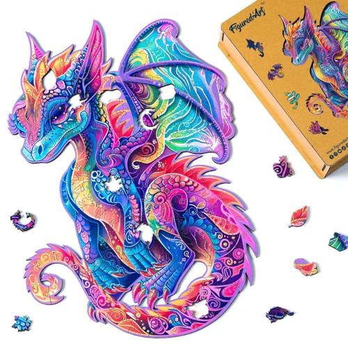 Figured'Art Träpussel vuxen och barn 200 bitar djur - vibrerande drake - originaldesign 30,4 x 41,1 cm unik form med premium trälåda, perfekt att ge som present