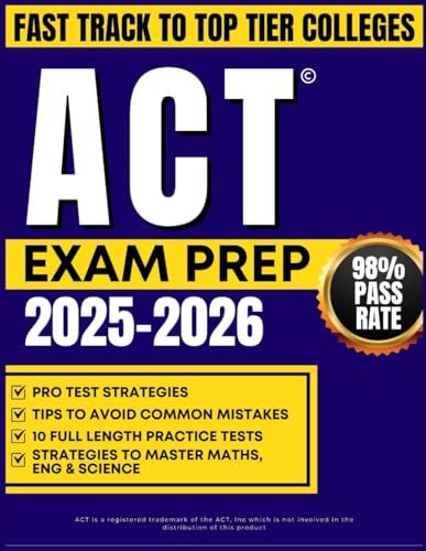 ACT EXAM PREP 2025-2026: Master Essential Strategies with 10 Full-Length Practice Tests to Excel in English, Math, Reading, and Science for Your Dream Score
