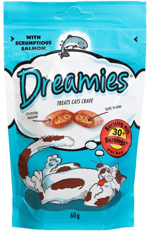 Dreamies Klassiska kattsnacks med lax, kattgodis med krispig konsistens och krämig fyllning, 4 x 180 g