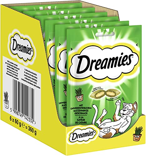 Dreamies Kattsnacks Catnip med kattmynta smak, 6-pack, 6 x 60 g – krispig utsida och krämiga kattgodis på insidan