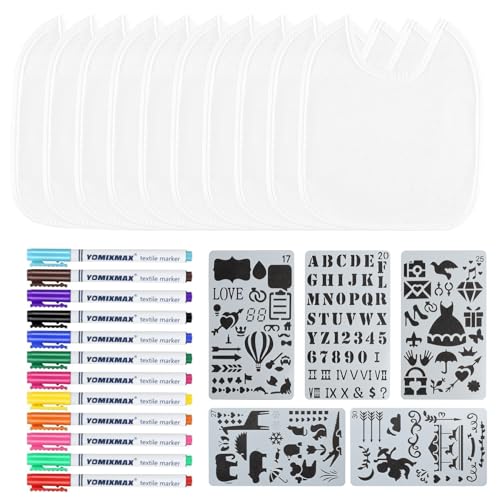 12 st. haklappar för målning, vit babyhaklapp, vattentät haklapp vit, bomull halsduk dregelhaklapp baby för babyparty babyshower party dekoration pojke flicka, med 12 textilpennor, 5 linjaler,