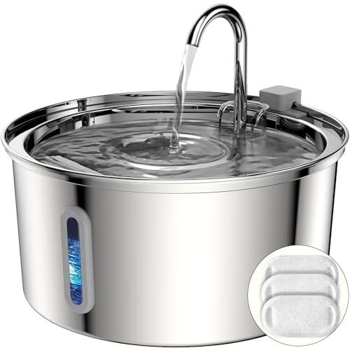 PLOOHT Dricksfontän för katt, stor kattfontän i rostfritt stål 3,0 l, metallvattendispenser med 2 pipar, 1 silikonpump och 2 filter, perfekt för katter, små hundar (adapter ingår)