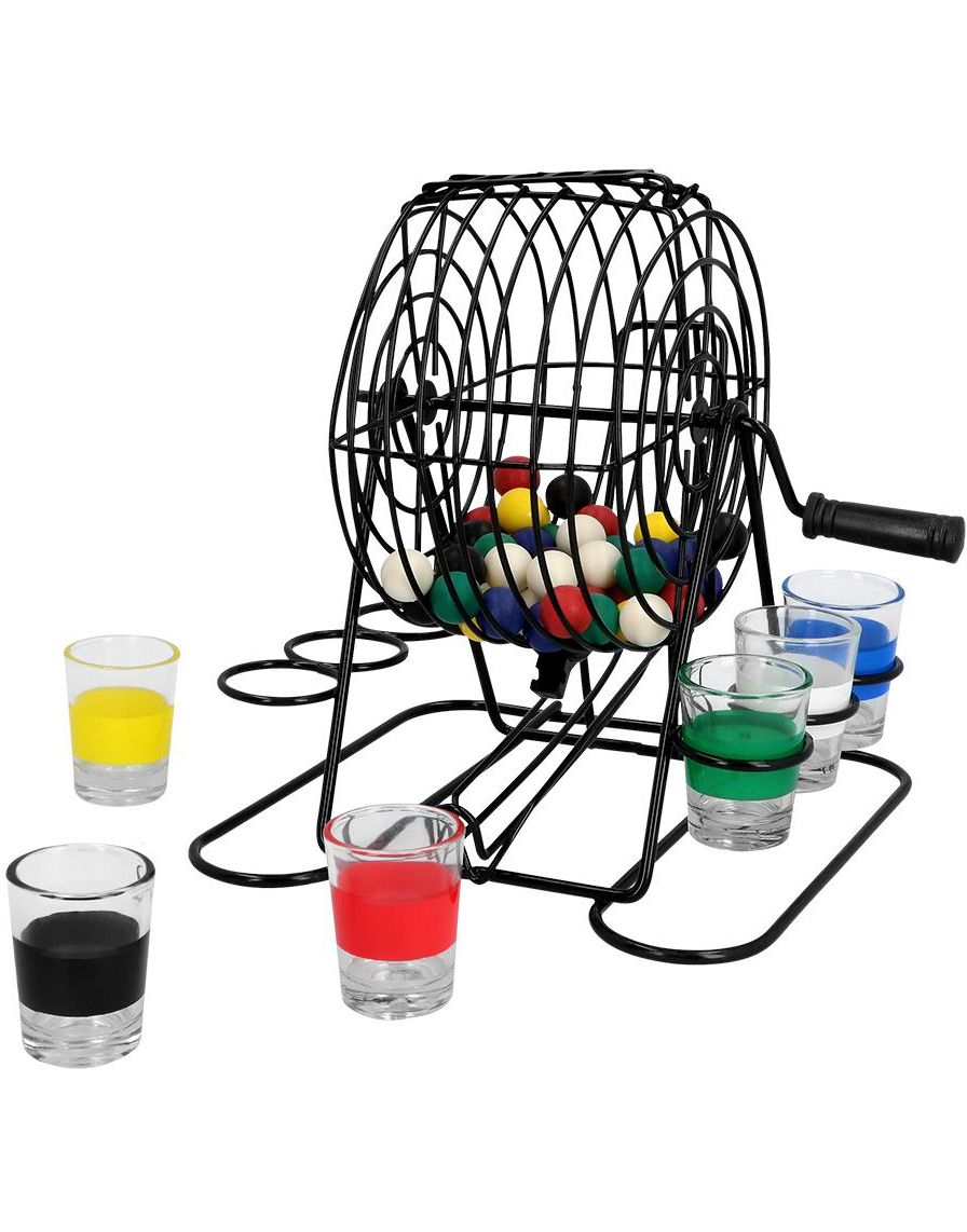 Relaxdays Unisex vuxen bingo, & hållare, skottglas, Par Relaxdays Drickspel Bingo Lotrumma med vevhållare 6 shotgl ser 48 kulor rolig Pa, färgglad, standard EU