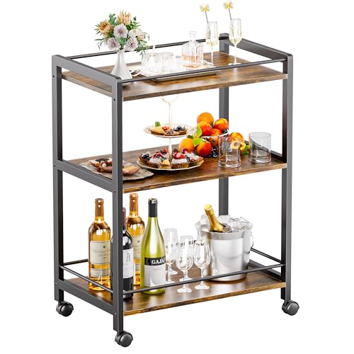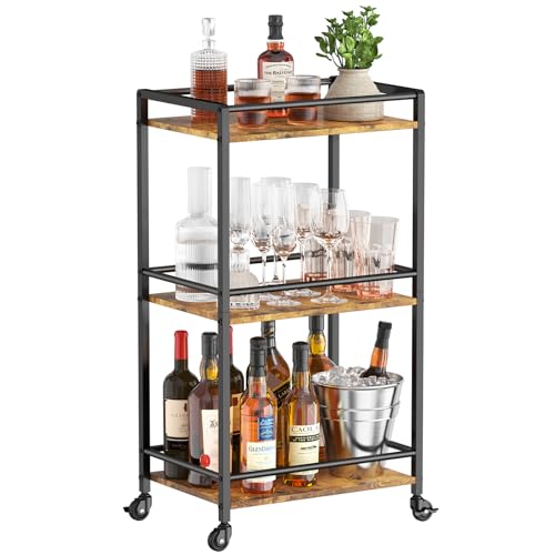 HITNET Barvagn, Serveringsvagn för hemmet, 3 nivåer Drinkvagn med hjul, rullande dryckvagn för kök matsal vardagsrum (Rustikt brunt och svart)