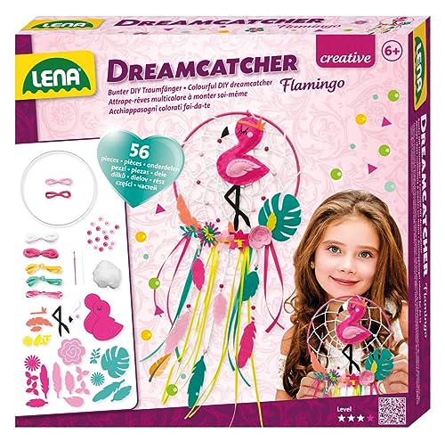 Lena 42700 Hantverksset Dreamcatcher Flamingo, 56 delar komplett set för drömfångare hantverk med ring, färgade band och snören, plastnål, pärlor och tygblommor, set för barn från 6 år, rosa
