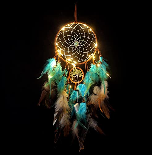 LED Drömfångare, Blågrön Indisk Väggdekorationer Handgjorda Söta Bröllopsgåvor, Sovrum Vägghängande Ornament Hantverk, Dekorationer för Flickor/Pojkar/Barn/Vänner