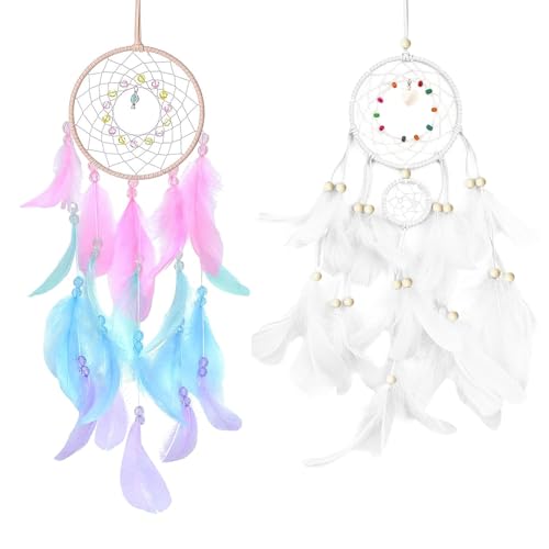 TAIHOBO Drömfångare för barn, 2 stycken drömfångare små för rum dekoration tonåring flickor, med vita och rosa påfågelfjädrar och färgglada pärlor, handgjorda drömfångare boho för dekoration barnrum
