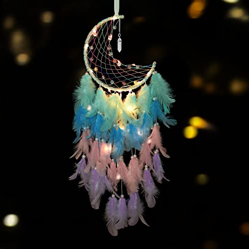 Dremisland Måne drömfångare med älva lampor handgjord drömfångare barn sovrum accessoarer regnbåge fjäder tur turkos hänge vägghängande dekoration för hem sovrum välsignelse gåva