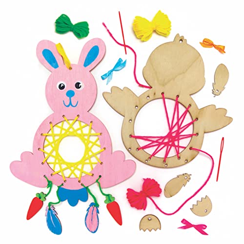 Baker Ross AX785 Drömfångare i trä med påskkyckling och kanin – paket med fyra, skapa dina egna drömfångarkit för barns konst och hantverk, väggdekorationer för barn