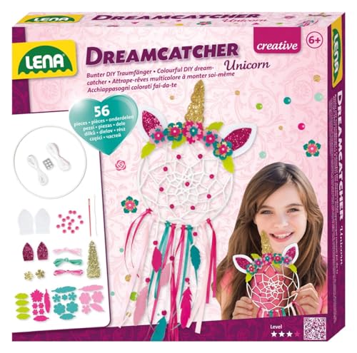 Lena 42701 Drömfångare enhörning hantverksset, 56 delar, komplett set för drömfångare hantverk med ring, färgade band och sladdar, plastnål, pärlor och tygblommor, set för barn, medium