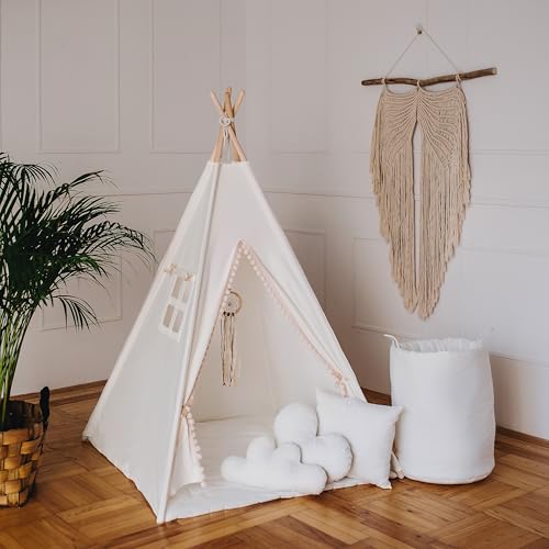 Homechic Barn tipi tepee, lektält Wigwam bomull, vit, kräm, boho, poms, golvmatta, 3 kuddar, 110 x 110 x 150 cm, drömfångare, premium