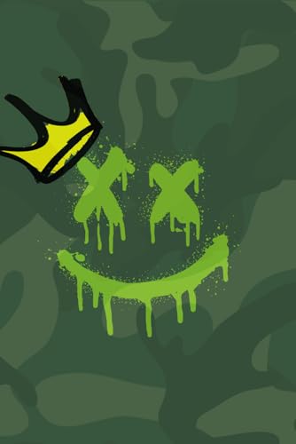 Notebook Journal, featuring a unique droopy smiley face element, set against army-inspired background.: Filled with lined pages and interactive elements that creates the best writing experience