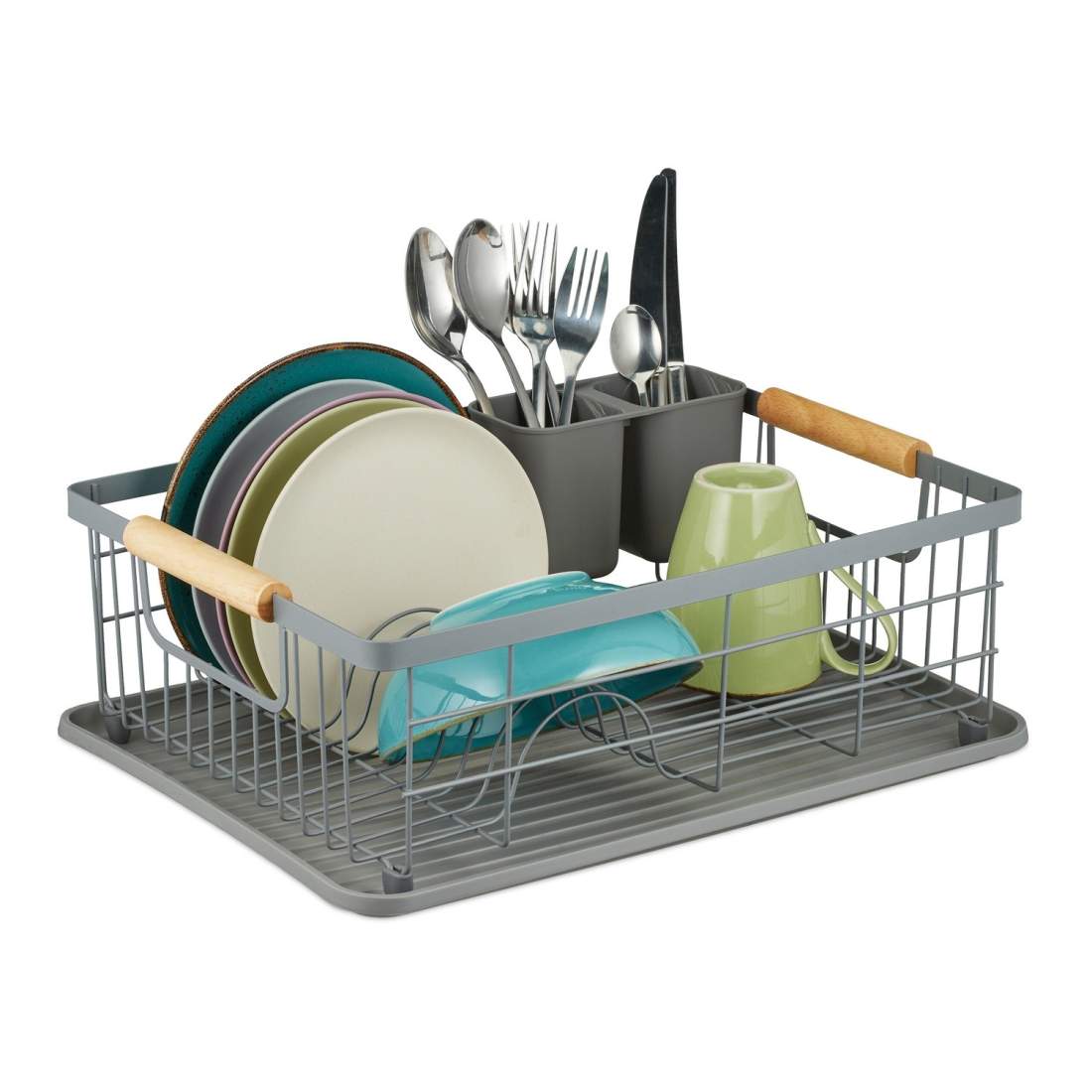 Relaxdays Dräneringsställ rostfritt stål med droppbricka och bestickfack 39,5 x 30,3 x 12,5 cm för tallrikar, bestick, glas, porslin diskstä