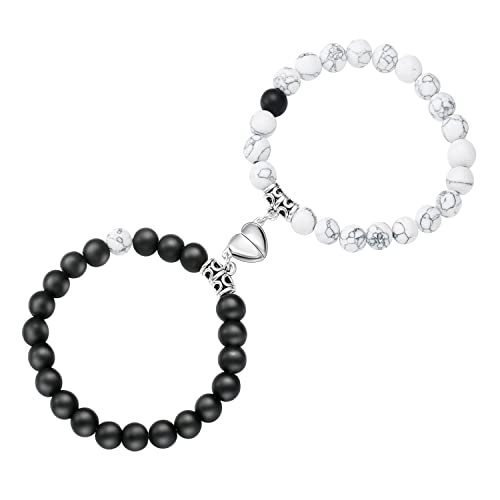 Magnet hjärta armband drottning och king krona natursten pärlor för par, 8 mm elastiska kärleksarmband av CZ kronor kung och drottning matta svart onyx, vänskapspresent till par partner, 19 cm, Sten