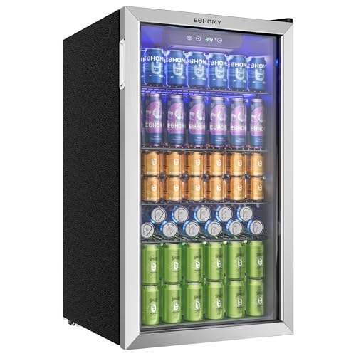 EUHOMY Dryckeskyl, minikylskåp för 126 burkar med glasdörr, litet kylskåp med justerbara hyllor för lemonad, öl eller vin, perfekt för hem/bar/kontor, silver, rostfritt stål