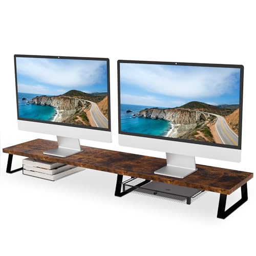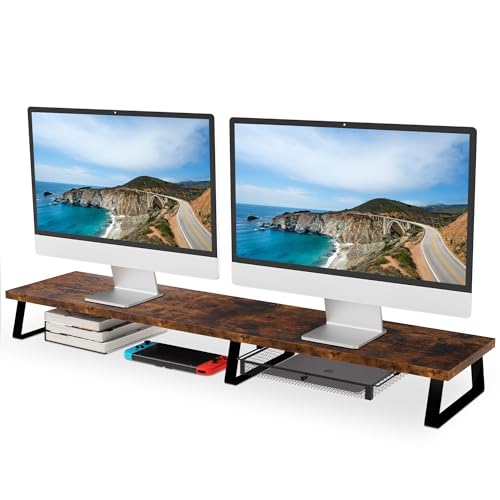 Fenge Dual Monitor Stand, monitorstativ höjare för 2 bildskärmar, 108 cm träskrivbordshylla med förvaringsorganisatör och kabelhantering för kontorsskrivbordstillbehör, Brun