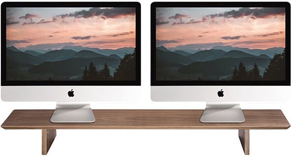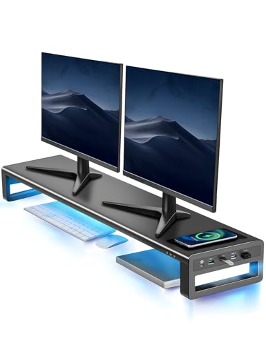 Fenge Dual Monitor Stand, monitorstativ höjare för 2 bildskärmar, 108 cm träskrivbordshylla med förvaringsorganisatör och kabelhantering för kontorsskrivbordstillbehör, EK