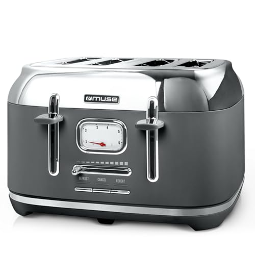 Muse brödrost i rostfritt stål i grå retrodesign, analog display, upplysta knappar, 6 rostningsnivåer, 4 skivor, MS-131 DG, vintage look, med smullåda