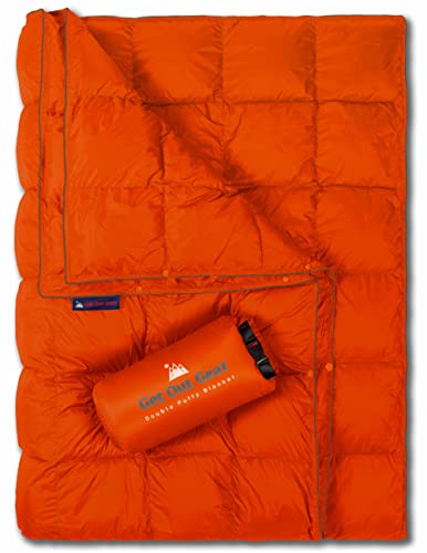 Get Out Gear dubbel puffig campingfilt – extra puffig, packbar, lätt och varm | perfekt för utomhusbruk, resor, arena, festivaler, strand, hängmatta | vattentåligt campingtäcke (orange/grå)