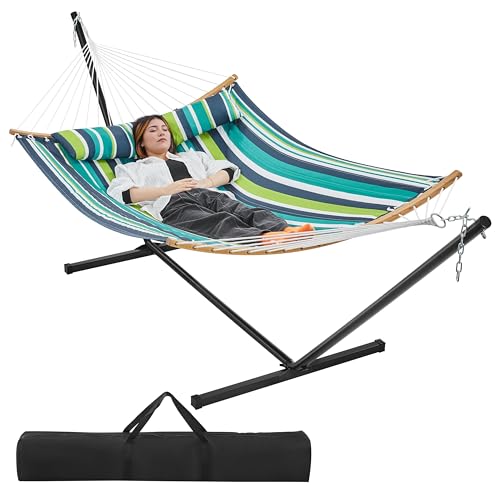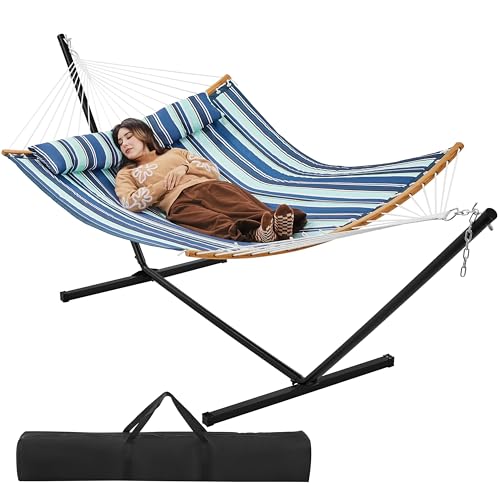 Yaheetech Hängmatta med ram och kudde, XXL dubbel hängmatta med stativ upp till 216 kg, kan belastas för 2–3 personer, höjdjusterbar hammock för utomhus och inomhus, blå ränder