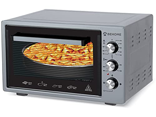 BEHOME Elektrisk ugn med luftcirkulation, 38 liter, med roterande spett, självrengörande och emaljerad, temperatur upp till 320°, dubbelglas med innerbelysning och timer, 2 bakformar och 1 grillgaller