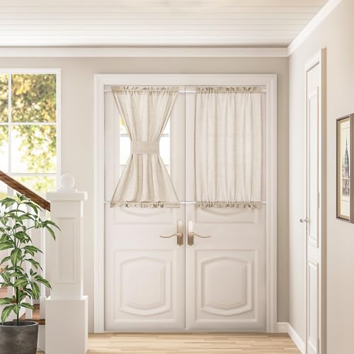 DUKIYO Linne beige genomskinliga gardiner för kök fönster badrum franska dörrgardiner 2 paneler dubbla stänger ficka halvgenomskinliga gardiner för glasdörr med bindning integritetsljusfiltrering B 25