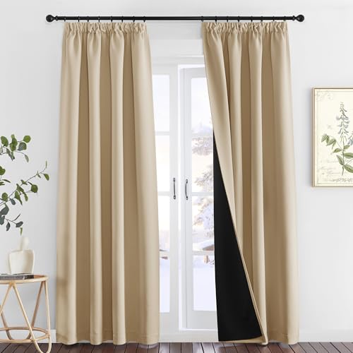 Pony Dance Termisk gardin med veckband gardiner beige ogenomskinlig set om 2 stycken H 220 x B 140 cm dubbla lager och tunga gardiner köldskydd mörkläggningsgardin för skena, Biscotti beige