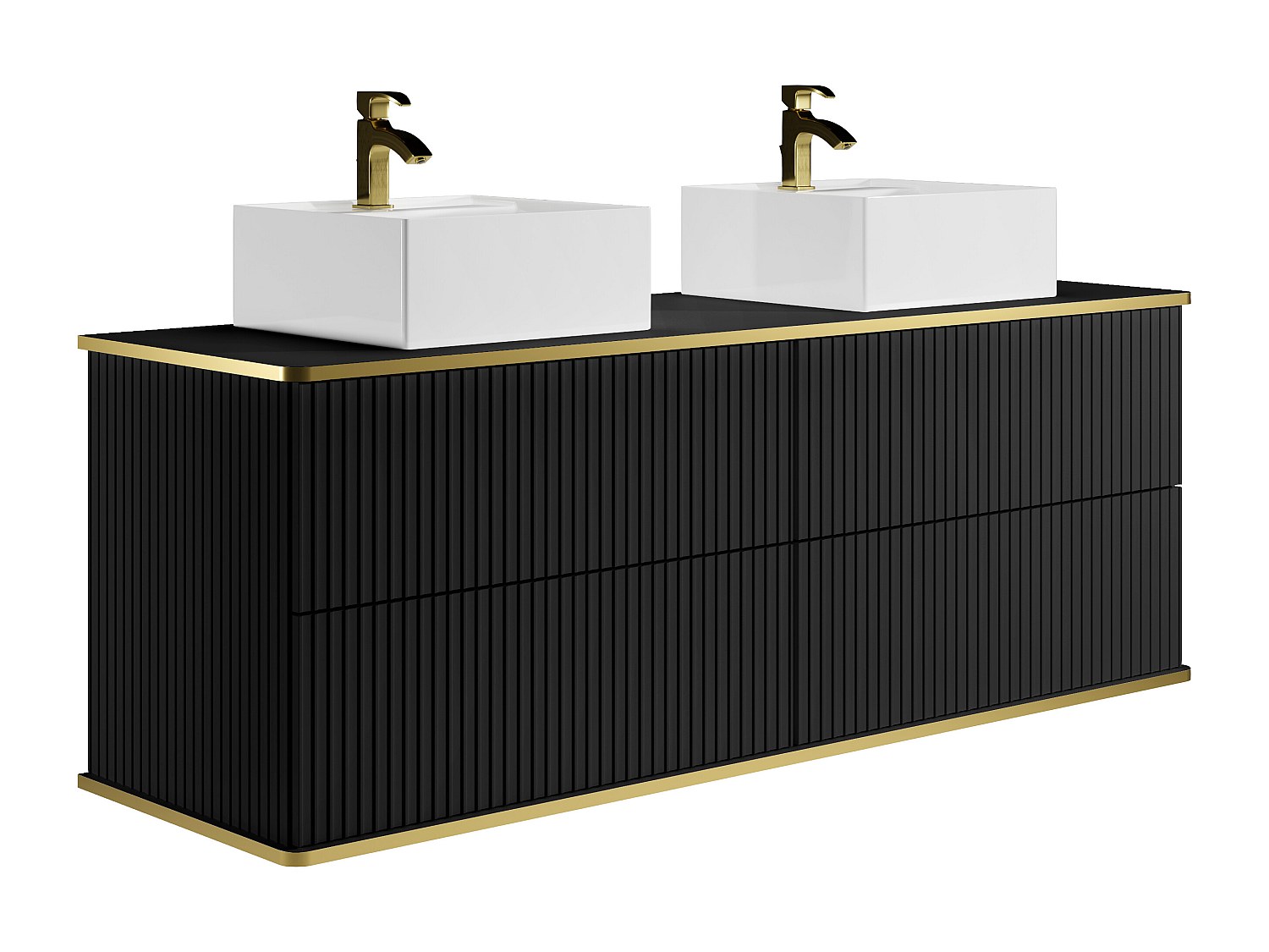 Vägghängd badrumsmöbel med räfflad struktur och guldrand med dubbla fyrkantiga nedfällda handfat - Svart - 150 cm - KELIZA
