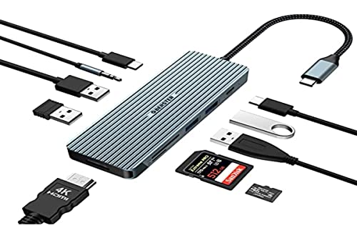 10-i-1 USB-C-dockningsstation-adapter med dubbla skärmar (4K HDMI, USB 3.0, 2 x USB 2.0, USB C, PD 100 W, ljud, SD/TF-kortläsare) kompatibel med MacBook Pro/Air, Surface Pro/GO och Type C-enheter