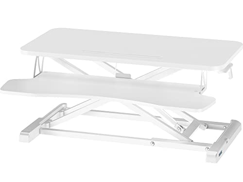 BONTEC Höj- och sänkbar skrivbordsförhöjare – Ergonomisk stå-sitt arbetsstation med två nivåer, gasspringsjustering, för dubbla skärmar och bärbar dator – Vit