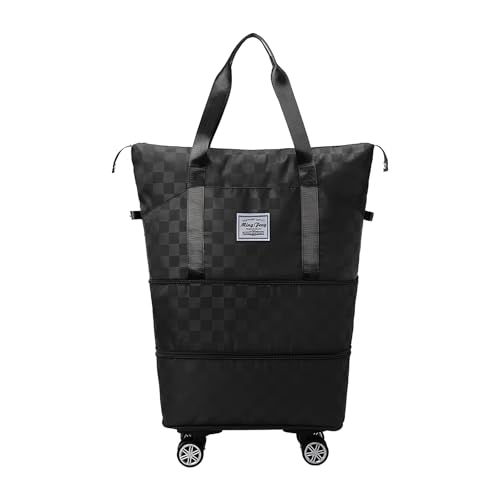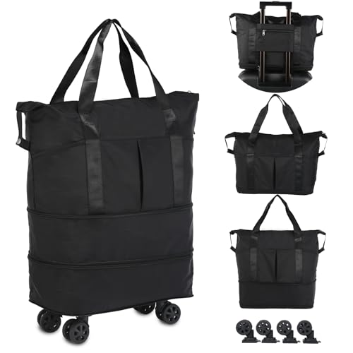 VOOWO Rullande duffelväska med hjul, expanderbar hopfällbar duffelväska med hjul för resor, rullande bagage duffelväska, resväska med hjul, stor helgväska för kvinnor och män, Svart, Expanderbar