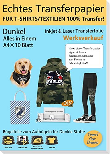 TransOurDream10 x A4 1A3 silikonpapper, bläckstråle/laser överföringsfolie strykfolie (svart folie), för mörka textilier polyester, polybomullsblandning, duk, ränder, rutig, jeans och kamouflage