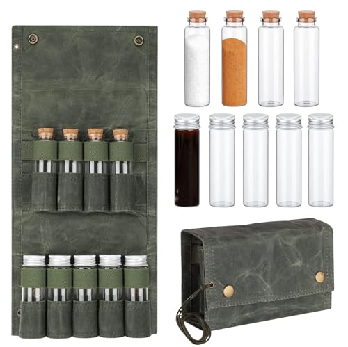 HOMURY Bärbar utomhuskryddpåse med 9 kryddburkar, bärbar utomhuskryddväska av duk, camping spice kit för camping, grillning, picknick utomhus (grön)