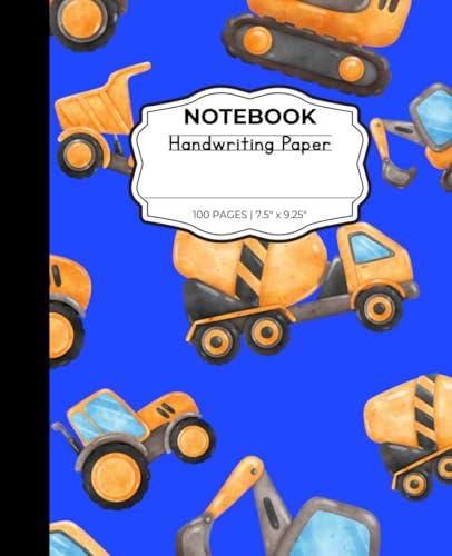 Blue Construction Trucks Notebook, Handwriting Practice Paper with Wide Lines and Dotted Center Line for Writing Practice, Excavator, Dump Truck, Mixer Truck, 100 pages, 7.5 x 9.25 inches