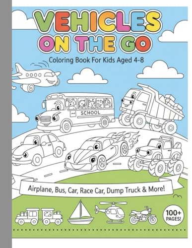 Vehicles On The Go Coloring Book For Kids: Airplane, bus, car, race car, dump truck, More Coloring Pages For Kids Aged 4-8