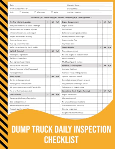 Dump Truck Daily Inspection Checklist: Pre-Trip Safety & Equipment Inspection Record for Construction, Hauling, and Industrial Operations.