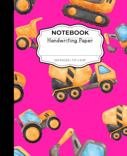 Bright Pink Construction Trucks Notebook, Handwriting Practice Paper with Wide Lines and Dotted Center Line for Writing Practice, Excavator, Dump Truck, Mixer Truck, 100 pages, 7.5 x 9.25 inches
