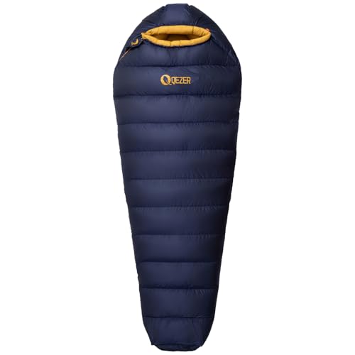 QEZER vinter sovsäck utomhus -3°C till -12°C [1210g-2360g] Varm lätt dunsovsäck för kall vädercamping, vandring och bergsklättring med 660 FP Premium Down (Blå 1000)