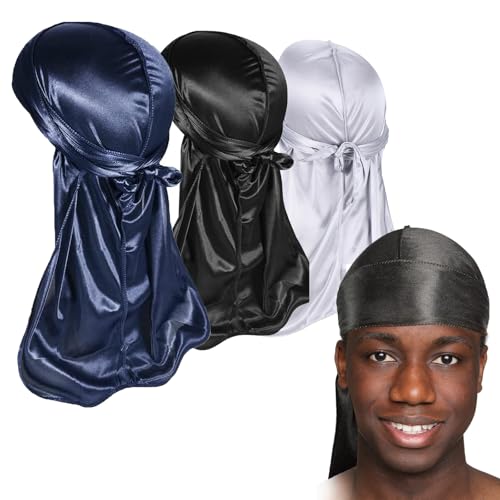 Comioke Silky Durag, Silk Du Rags för män och kvinnor, Silky Durag för män, premium satin Do Rags do Rags med lång svans för 360 vågor, perfekt för vågor, Svart + marinblå + grå, one size