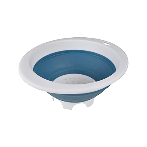 Läcker 2-delad durkslag i plast med behållare, siktsil, durkslag med blandningsskål, perforerad sil, diskmaskinssäker, dimensioner, 26 x 24 x 17 cm, färg, ljus och mörkblå