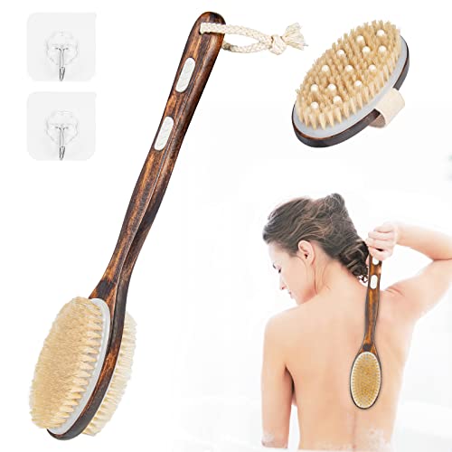 FREATECH Duschborste med Långt Trähandtag Rengör Enkelt Ryggen, 2-sidig Badborste, Kroppsborste med Hård Naturlig Borst och Mjuk Nylonborste för Torr och Våt, Exfolierar och Slätar Huden