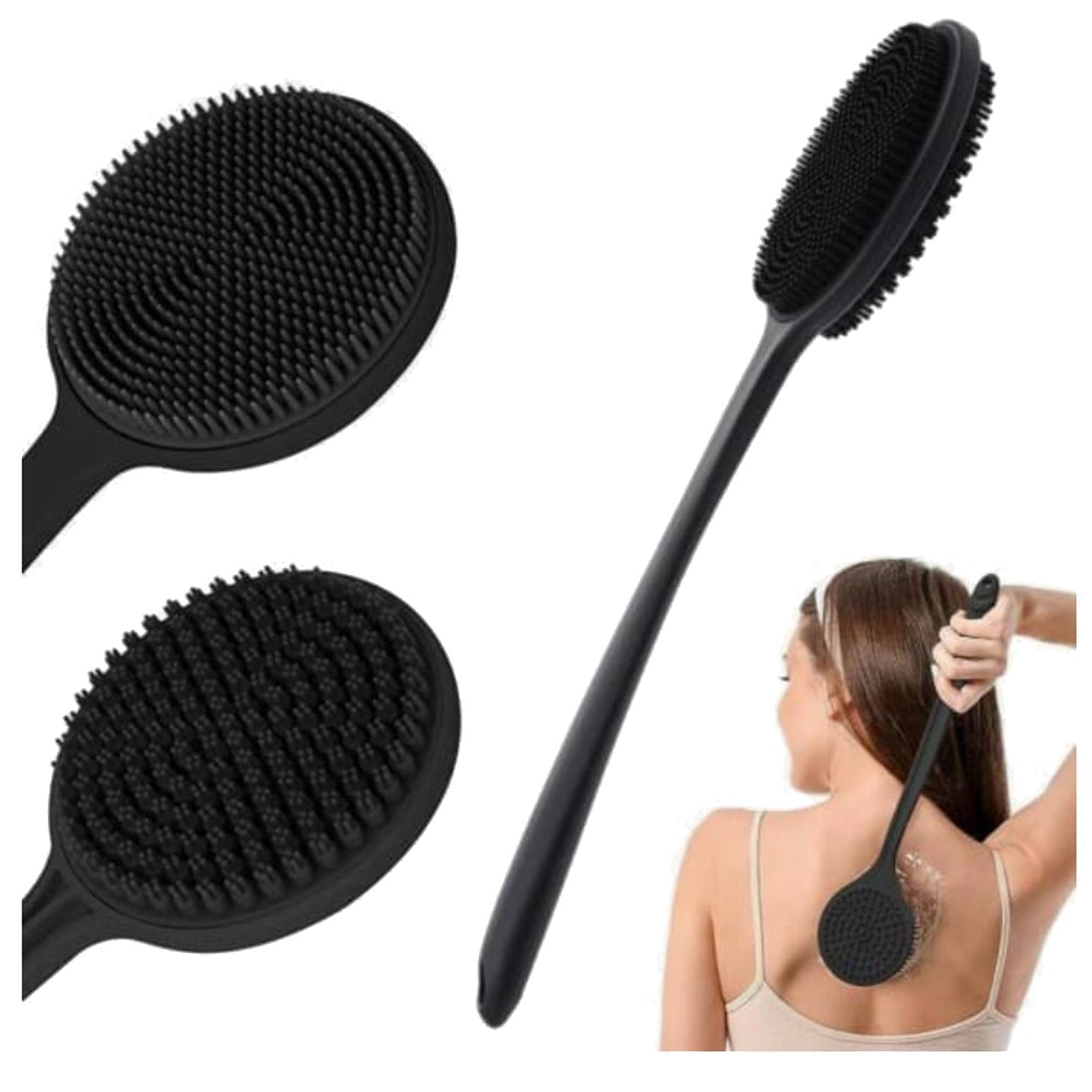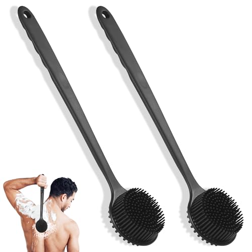 Silikonkroppsskrubb för dusch med långt handtag, dubbelsidig duschborste för dusch exfoliering och massage kan producera rikt skum, långt handtag bakskrubbare för män