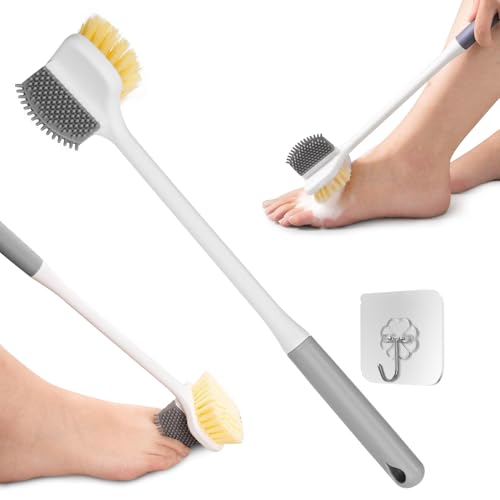 GROOFOO Fotborste för duschen, multifunktionell fottvättsborste, fotborste med långt handtag, tågluff, rengöringsborste, peeling för dusch, duschborste för seniorer, dubbelsidig fotrensare (grå)