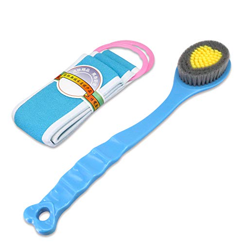 QiCheng&LYS badkroppsborste, badborste, duschborste med långt handtag, massageborste dusch baksida skrubb 14 tum (Blå + handduk)