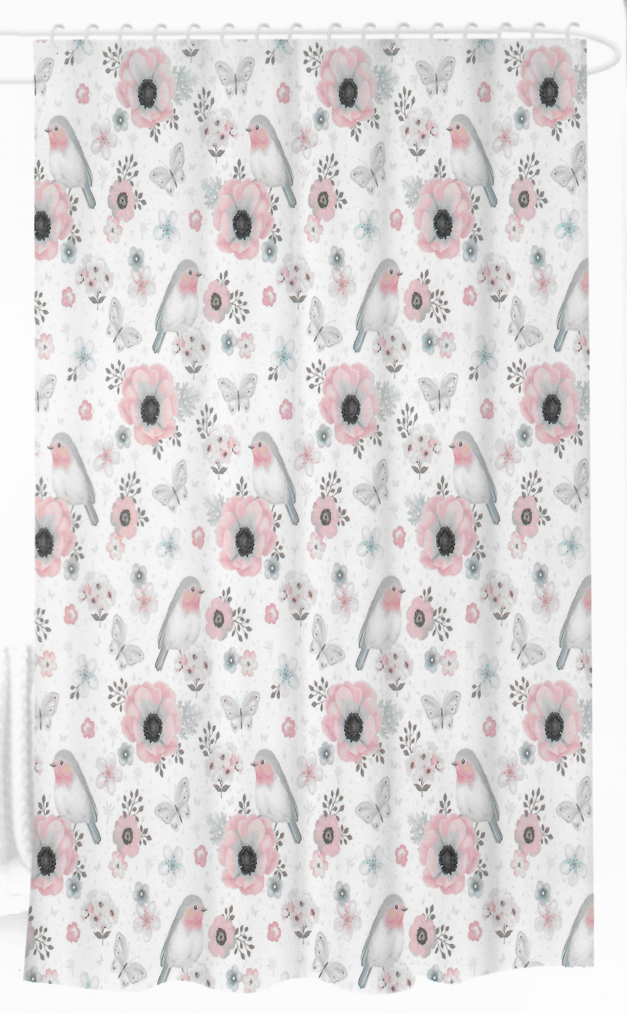 Duschdraperi - 180x180 cm - Vit med blommor och fåglar - Klar att hänga