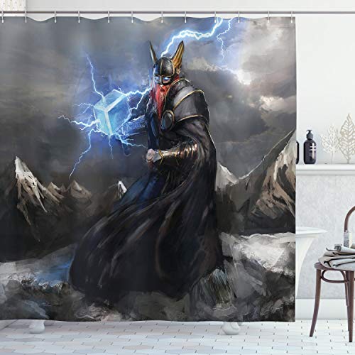 ABAKUHAUS viking duschdraperi, Thor Mjölnir och åska, tygligt tyg badrumsdekorationsset med krok, 175 x 240 cm, flerfärgad svart