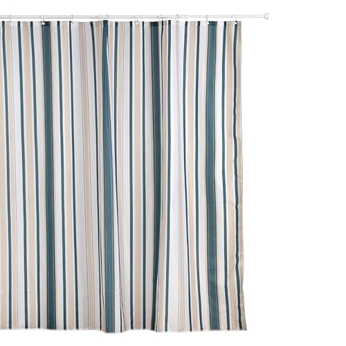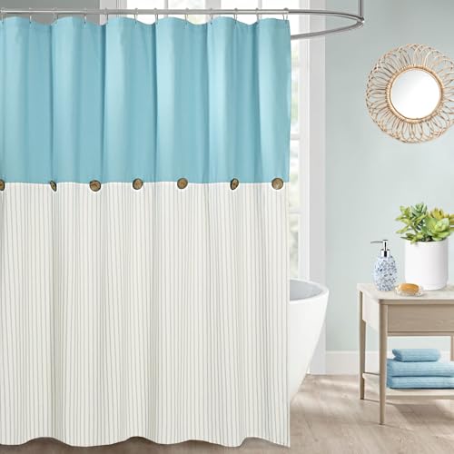 DOSLY IDÉES bondgård teal duschdraperi för badrum, beige och blå rand, knappgardin, bomullsblandning vävt tyg, rustik berlock lantlig chic stil, 183 x 183 cm