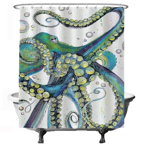 Ulticool Duschdraperi, bläckfisk, hav och natur, antimögeleffekt, tvättbart, vattentätt, med 12 ringar, grönt-vitt, 180 x 200 cm