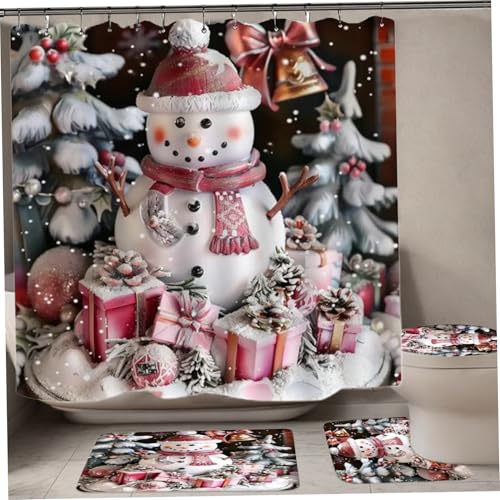CNAFGBGG Set med julduschdraperi, 4 st/set söt snögubbe jul badrumsset med halkfri golvmatta, U-formade mattor, toalettlocksskydd och duschdraperi med 12 krokar för juldekor.